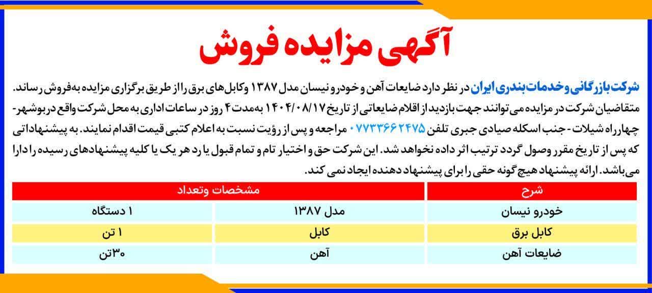 شرکت بازرگانی و خدمات بندری ایران با استفاده از اسکله اختصاصی در بندر بوشهر از سال ۱۳۶۷ با بکار گیری نیروهای مجرب و باتجربه به ارائه خدمات ترخیص، اجاره مخزن، بارگیری کشتی پرداخته است.